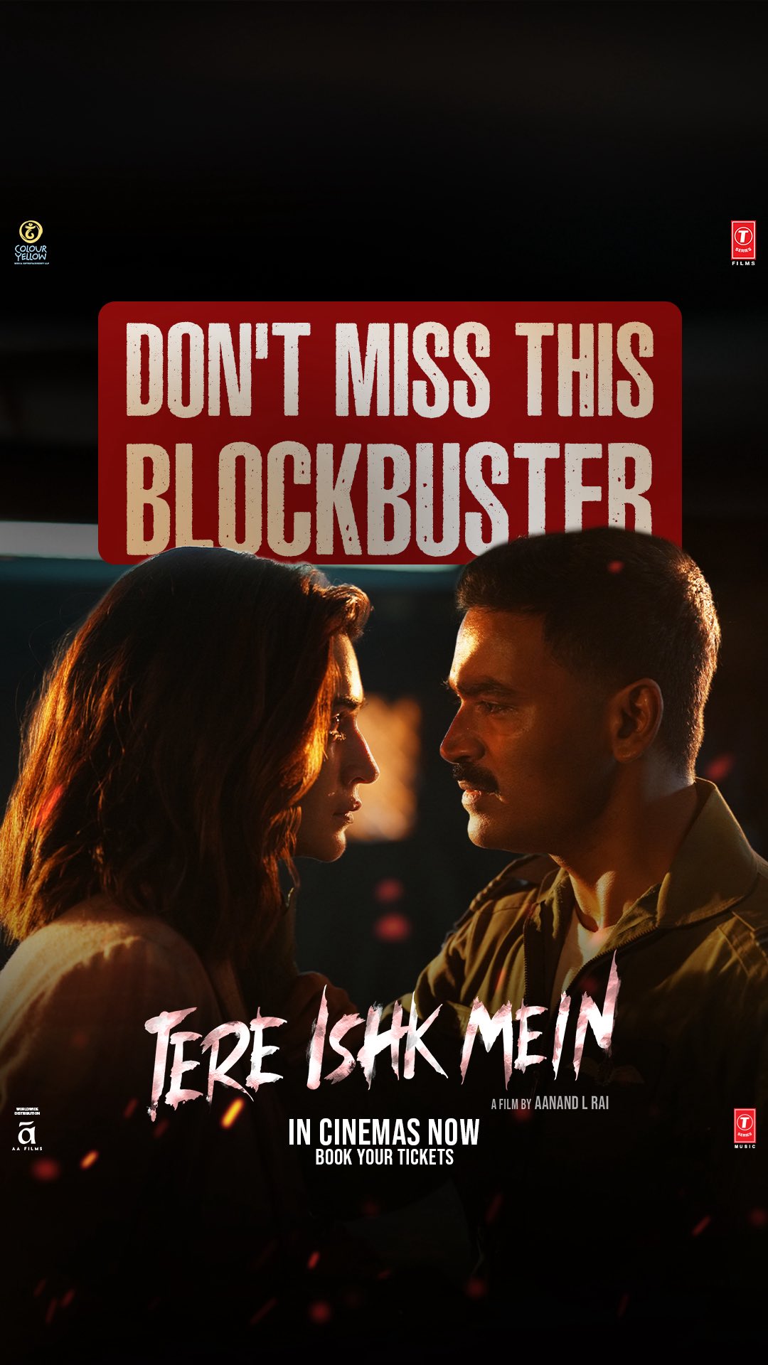 ISHK that moves you and breaks you at the same time!❤️🔥#TereIshkMein now in cinemas worldwide, in Hindi, Tamil and Telugu.Book your tickets now: Link in Bio!@dhanushkraja @kritisanon @arrahman @aanandlrai #BhushanKumar #HimanshuSharma #KrishanKumar @irshadkamilofficial @neeraj.yadav911 @shivchanana @neerajkalyan24 @tseriesfilms @tseries.official @colouryellowmovies @aafilms.official